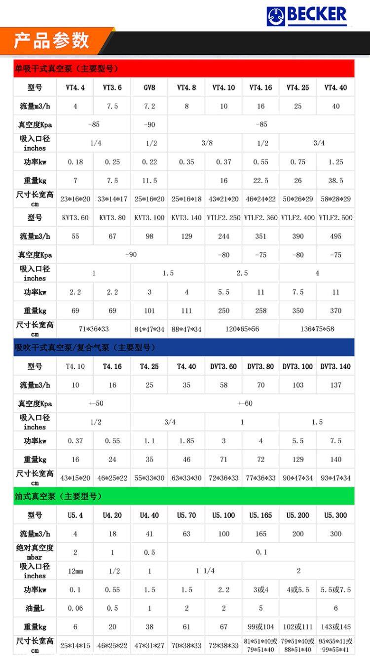 产品详情: BECKER贝克真空泵是为满足真空泵的吸入需要而自行开发的下一代风冷真空泵,有着先进的设计和新颖的构造,适用于各种要求更高和繁复的应用领域可普遍用以机器,原油,化工,电力,制药,食品,陶瓷,制糖,印染,冶炼,塑料,瓷砖,皮革等行业。它特别适于用以塑料。贝克公司自1885年开始设计。真空泵的生产已有120年真空产品专业制造历史。其中,无油泵以其高风压,平稳的性能,低温,低噪声,环保,使用寿命长,维护便捷。它在印刷行业保有很高的名声,例如德国ROLAND罗兰,德国KBA(高宝)以及其他人选项贝克泵作为其包装机的包装。也以高风压,安定的性能,低温,低噪声,低废气排放,使用寿命长和容易维护而有名。它适用于电子产品,包装,工业运输,医疗装置,环保,建筑物和激光。,实验室,精细仪器等领域