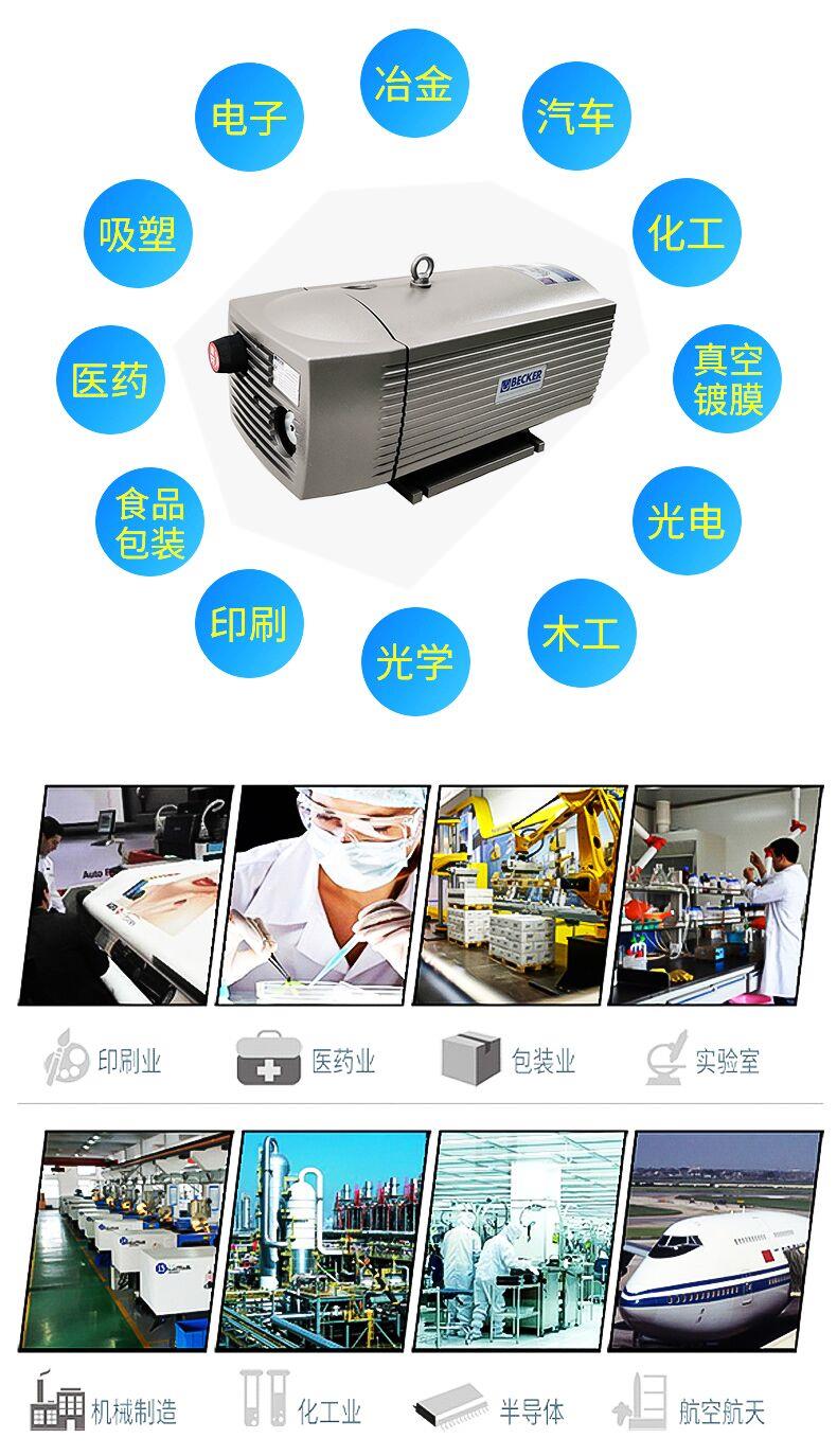 产品详情: BECKER贝克真空泵是为满足真空泵的吸入需要而自行开发的下一代风冷真空泵,有着先进的设计和新颖的构造,适用于各种要求更高和繁杂的应用领域可普遍用以机器,原油,化工,电力,制药,食品,陶瓷,制糖,印染,冶炼,塑料,瓷砖,皮革等行业。它特别适当用以塑料。贝克公司自1885年开始设计。真空泵的生产已有120年真空产品专业制造历史。其中,无油泵以其高风压,平稳的性能,低温,低噪声,环保,使用寿命长,维护便利。它在印刷行业拥有很高的声名,例如德国ROLAND罗兰,德国KBA(高宝)以及其他人选项贝克泵作为其包装机的包装。也以高风压,平稳的性能,低温,低噪声,低废气排放,使用寿命长和容易维护而有名。它适用于电子产品,包装,工业运输,医疗装置,环保,建筑物和激光。,实验室,精细仪器等领域